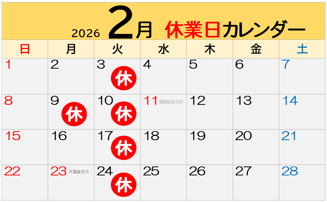 2月は、9日(月曜)がお休みです